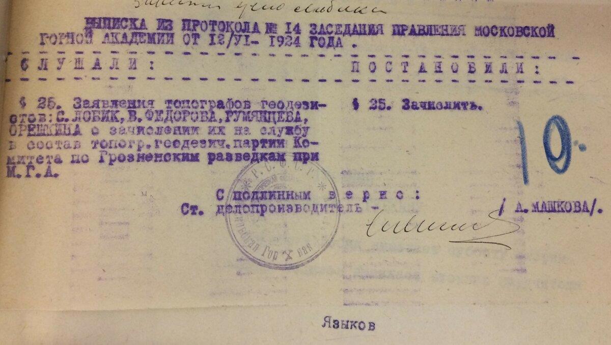 «Параграф 25. Слушали: Заявление топографов геодезистов С. Лобик, В. Федорова, Румянцева, Орешкина о зачислении их на службу в состав топогр. геодезич. партии Комитета по Грозненским разведкам при М.Г.А. Постановили: Зачислить».