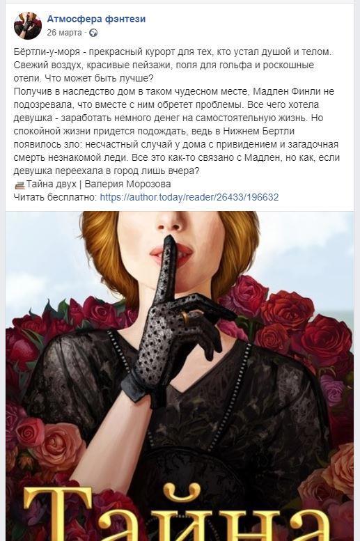 Я рекламировала свою более просту книгу. Сейчас у меня их две - более менее шаблонный уютный детектив и неформатное темное фэнтези. Для ком.статуса я использовала уютный детектив.