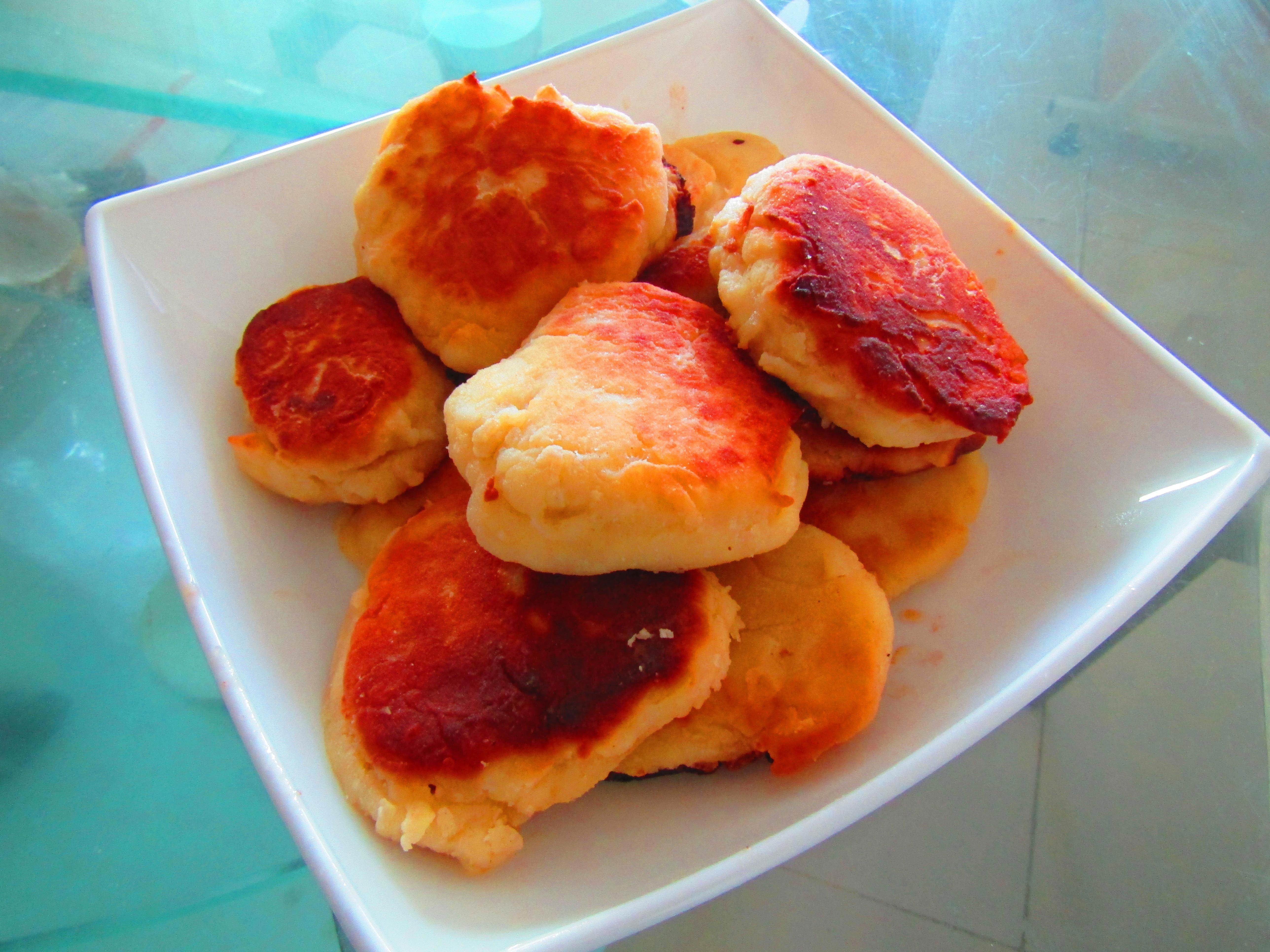 Полученную массу зачерпываем ложкой и хорошенько обваливаем в муке. Полученный «шарик» сплющиваем и отправляем на разогретую сковородку жариться.