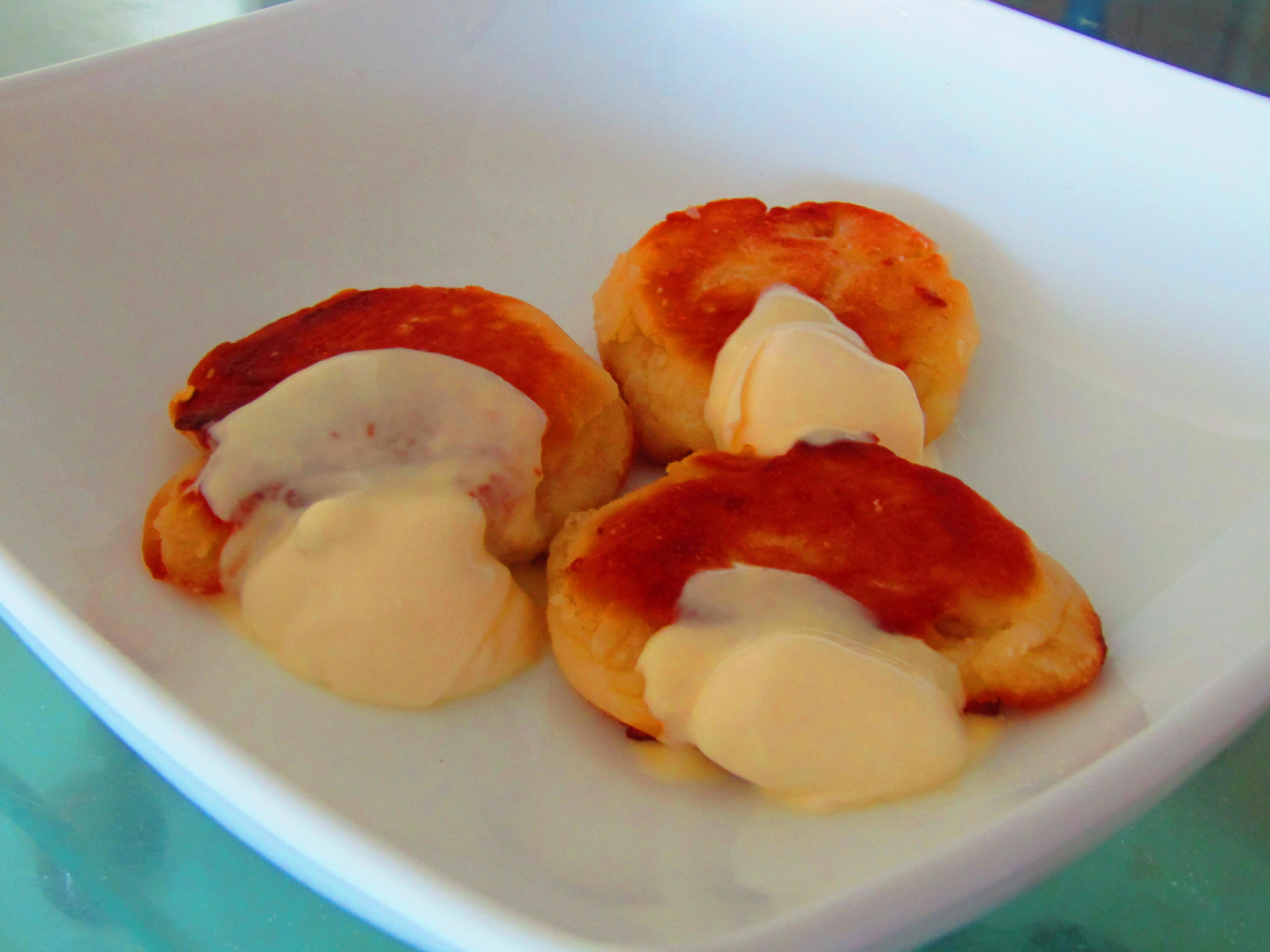 Как лепешечки подрумянятся, их следует перевернуть, подождать, пока подрумянятся и с другой стороны, а потом выложить на тарелку. Превосходно идут как со сметаной, так и с вареньем или с медом.