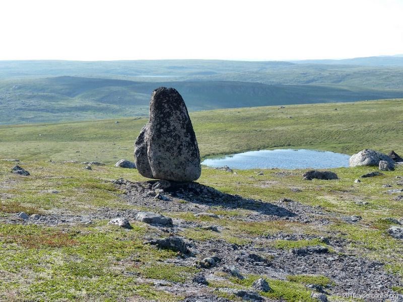 Итак. «Классика» сейда – здоровенный валун, весом в десятки тонн иногда, стоящий на маленьких камешках и наверху ещё один – «шапочка» (так их чаще всего называют). Однако на самом деле сейды куда разнообразнее. Они бывают округлыми, угловатыми, плоскими, зооморфными. Они могут лежать горизонтально, под углом и стоять вертикально. Количество опорных камней может быть два, три и больше. Есть и такие, которые установлены на целом постаменте из других огромных камней. Самое интересное, что опорных камней может не быть совсем, да и сам камень может быть установлен не жёстко – они качаются … тысячелетиями! И не падают. Дело осложняется тем, что сейды отнюдь не одиноки – их соседями являются каменные лабиринты, каменные «троны», другие явно искусственные сооружения из камней. Но оставлю их пока, чтобы не запутаться окончательно.