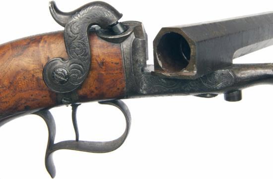 Один из примеров капсюльного оружия, нарезной дуэльный пистолет Перн-Лепаж с поворотным стволом.