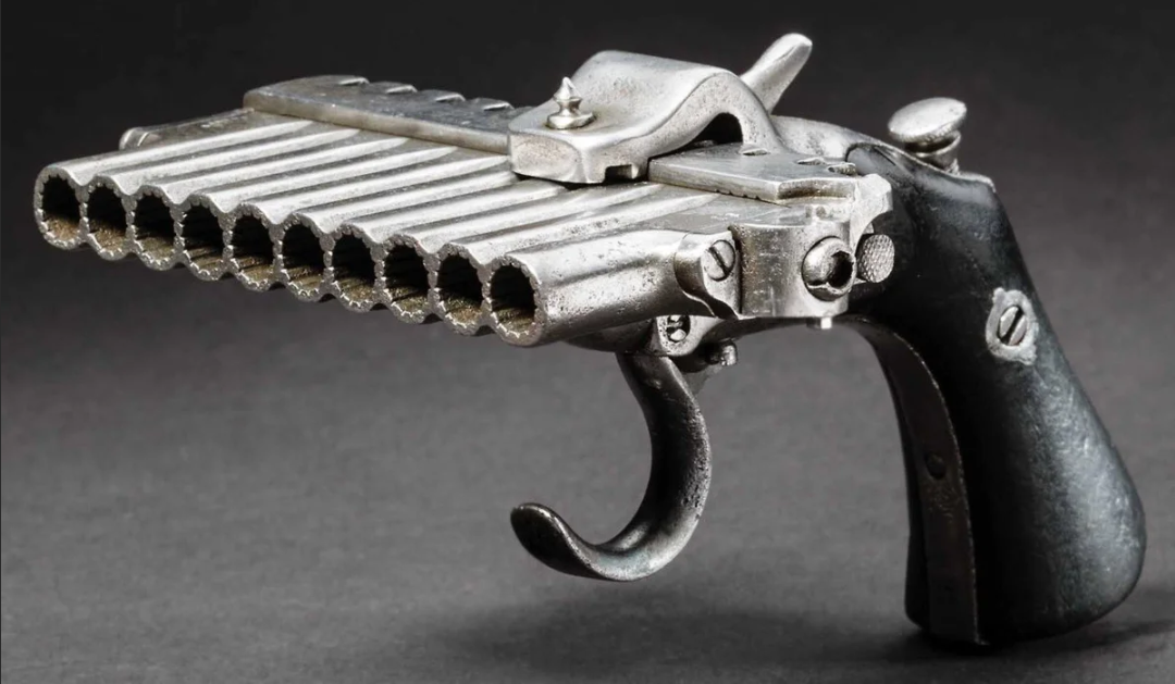 Многоствольная перечница (бундельревольвер). Гладкоствольная, в стволах не нарезы, а насечки под ключ для снятия стволов.