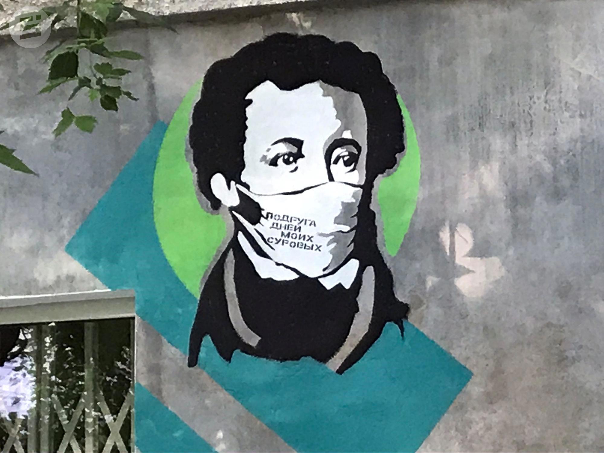Александр Пушкин пока единственный, кто «соблюдает» масочный режим. Соседствующий с ним Достоевский, а также прочие поэты и прозаики соблюдают дистанцию без средств индивидуальной защиты