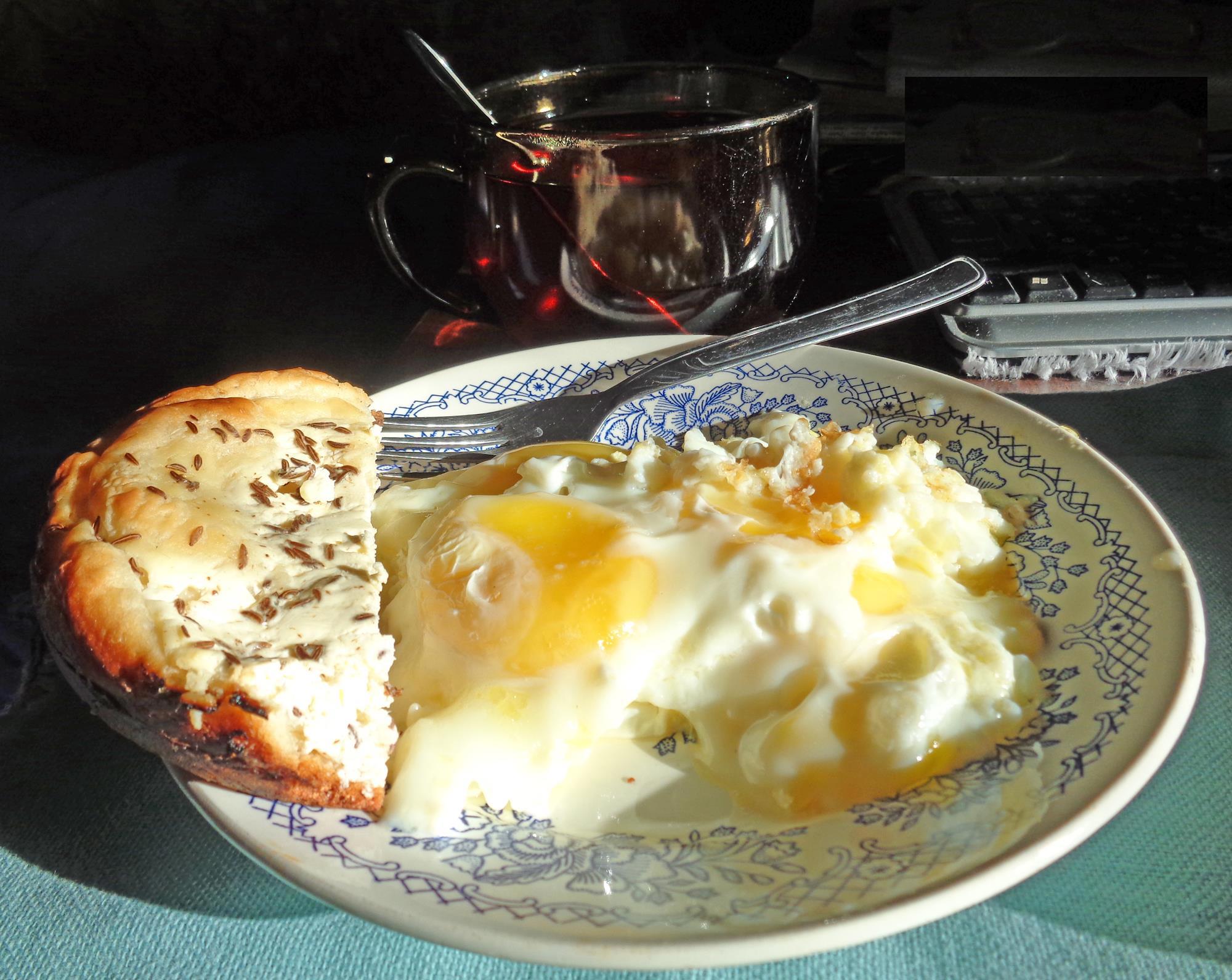 Это мой завтрак: яичница, сметанная лепёшка с тмином (сама пекла) и каркаде:
