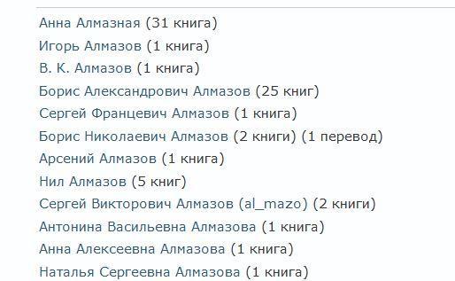 Если что, не удивляйтесь, 31 книгу я не написала, там большей частью рассказы. Которые не знаю что там делают. Но я иду первой строкой. За мной... как вы видите - 11 авторов. Я зашла в профиль каждого. Нигде слова нет насчет имени автора, кроме одного... угадайте кого?
