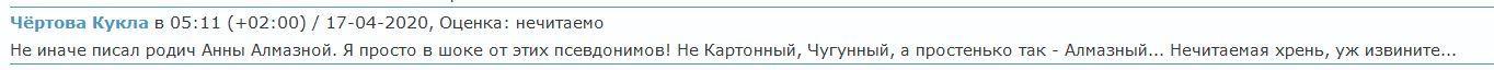 Автор: Анна АлмазнаяВ очередной раз зашла речь о псевдонимах, вернее, моем псевдониме. И я тут задумалась... может, реально я не права? И это моя и только моя вина, что меня так воспринимают? А ведь по сути первоначально псевдоним был "Анна Алмазова", но потом вскоре оказалось, что такая уже есть. При этом солидный автор, учебник по русскому языку вроде как написала. И я живенько, пока не было поздно переименовалась. Но с другой стороны, раз такая есть...