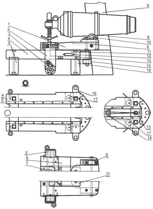 1 — станок; 2 — опора станка; 3 — колесо опоры; 4 — брус платформы; 5 — задняя подушка; 6 — основа станка; 7 — упор подъёмного винта; 8 — проём порта; 9 — горбыль; 10 — ось; 11 — направляющий брус станка; 12 — отверстие для лопаря; 13 — гак крепления лопаря; 14 — бортовая подушка; 15 — передняя подушка платформы; 16-обух; 17-блок платформы; 18-блок станка