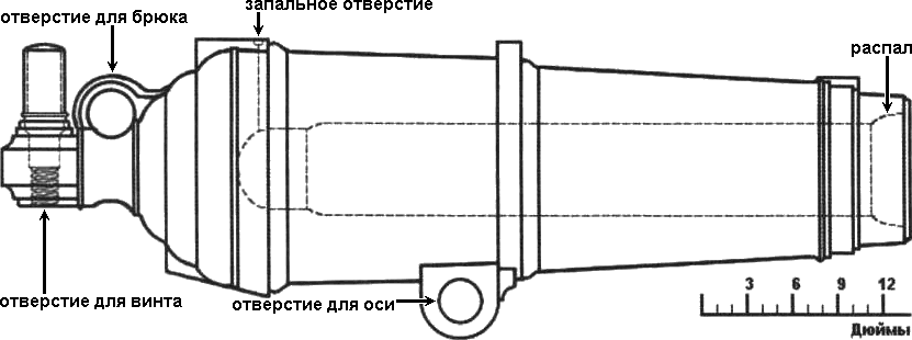 - запальное отверстие - приводит в камору, которая у каронады всегда меньше калибра ствола