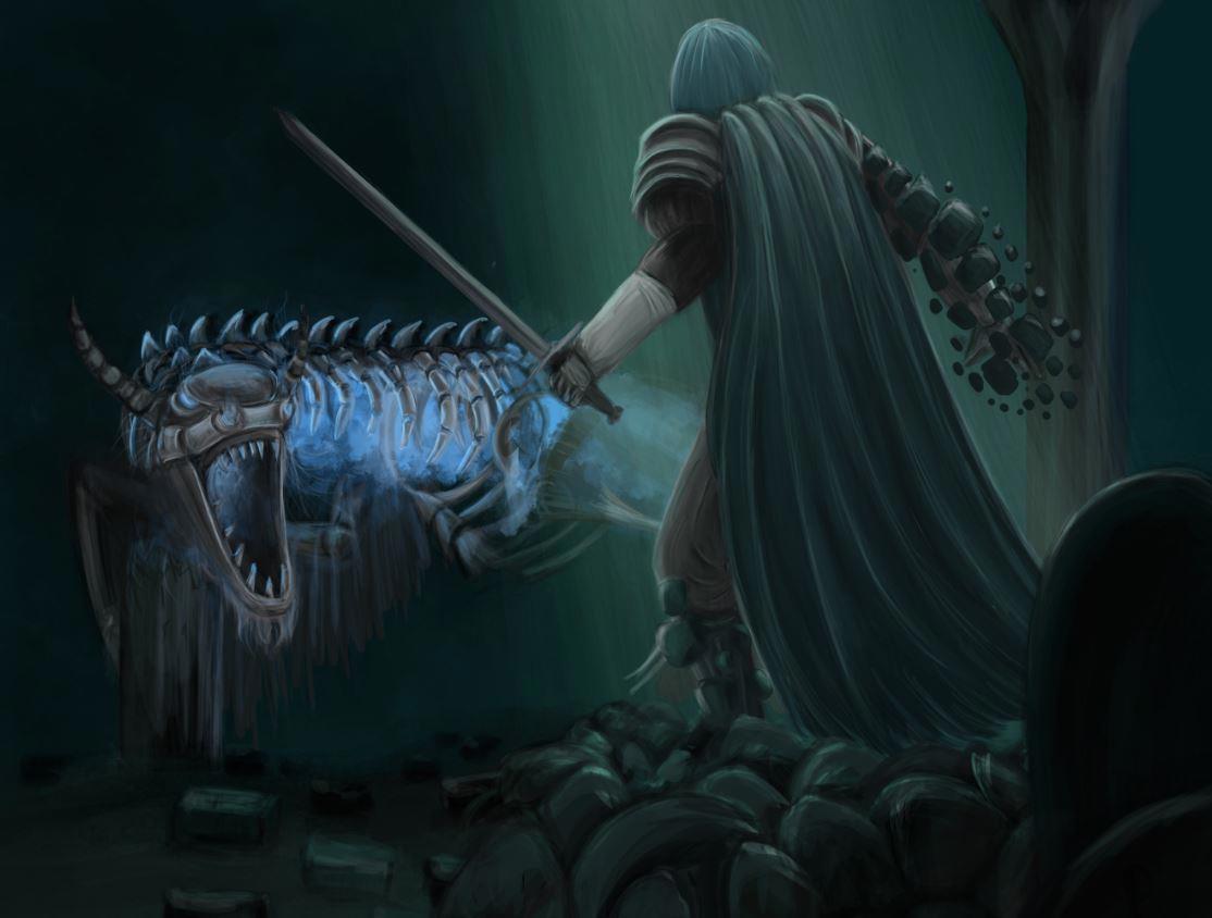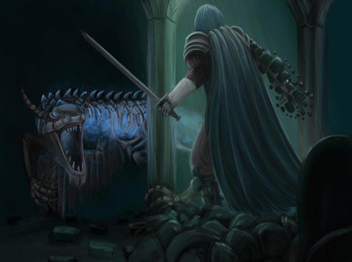 Как убить существо, состоящее из костей и не имеющее никаких внутренних органов? Попробую отпилить тебе голову, может тогда ты сдохнешь. Дракон, который, вероятно, был озадачен моим появлением, держался от меня на расстоянии нескольких метров. Тварь была метра четыре длинной и ещё не до конца сформировалась, так как на спине присутствовали небольшие костяные крылья. Как тварь собиралась на них летать, я не знал, но подозревал, что для этого ей пригодится живая плоть. Я же не планировал становиться завтраком для дракона, поэтому, выставив перед собой меч, кружился вокруг монстра, стараясь зайти ему с фланга, но тварь, подобрав под себя конечности, кружилась вслед за мной.