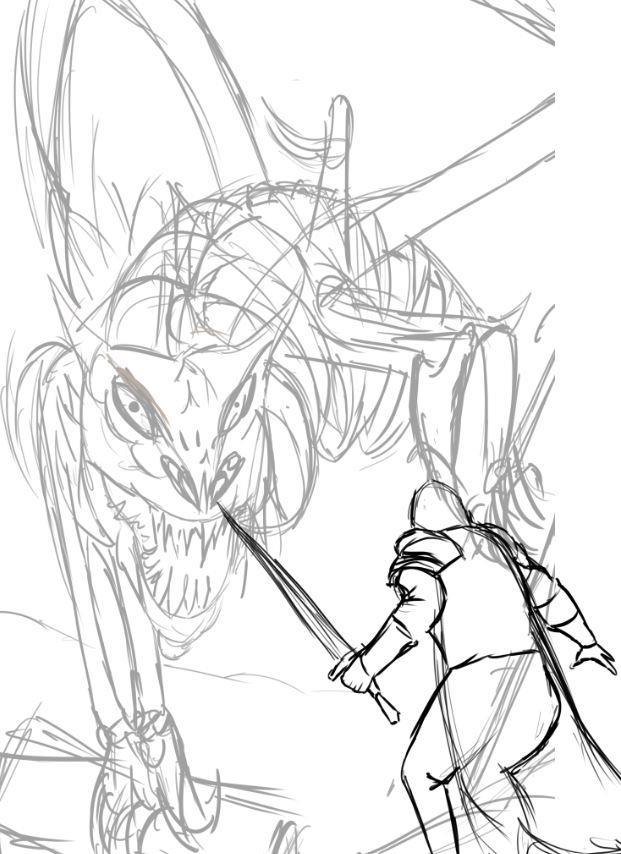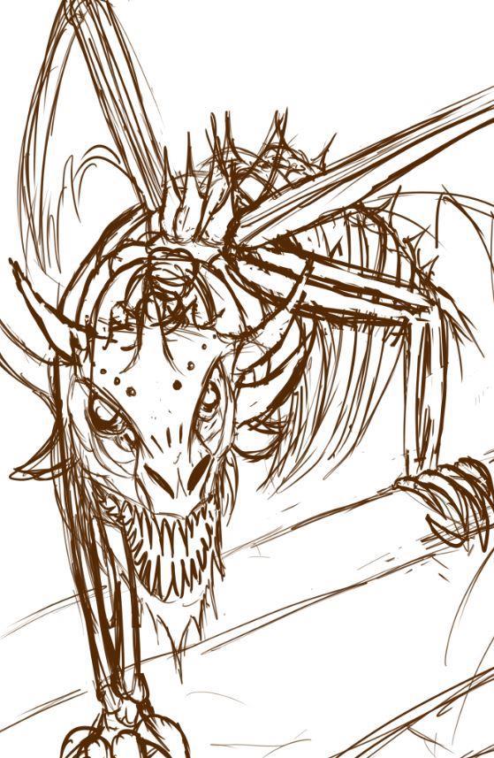 И, если с ГГ все понятно, то с драконом непонятно ничего. Это был мой первый дракон в жизни! Да еще и костяной! Макет и перерисовка заняли несколько дней. Мне постоянно не нравился результат в цвете, поэтому приходилось все зачеркивать и заново начинать со скетча.
