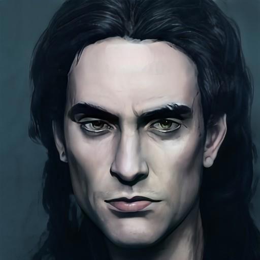 Некромант по имени Некр (вот так вот просто и не оригинально, но на то была воля героя). Единственный, зараза, неудачный от слова вообще портрет. Даже в первой наводящей жуть жуткую версии выглядит похожее. Однако без него никак. Пусть висит, аки Янус в двух лицах. :)