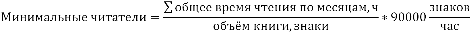 Для расчёта минимального количества читателей, исходим из предположения (априори ложного), что каждый, открывший вашу книгу, дочитал её до самого конца (или докуда вы там её написали). Соответственно, нужно узнать, сколько у среднестатистического читателя ушло на это времени. Я исходил из средней скорости чтения в 1500 знаков в минуту (этот показатель легко гуглится) или 90 тыс. знаков в час. Получается, объём произведения просто надо поделить на 90 тыс. В моём случае получилось 11 часов.