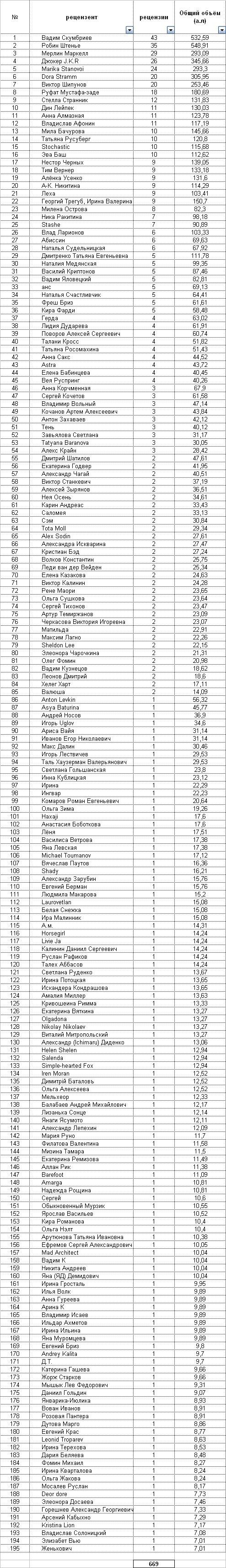 В нижеприведённой таблице сортировка первоначально идёт по количеству написанных рецензий, вторичный критерий - объём рецензируемых книг.