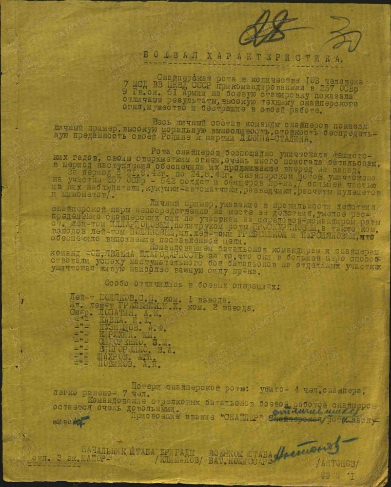 "Нашел документ в фонде 257-й осбр о стажировке роты снайперов 7 мсд ВВ НКВД в период 21 - 24 августа 1942 года и об их успехах в 642 уничтоженных немецких солдат и офицеров (понятно что часть должна быть раненными).