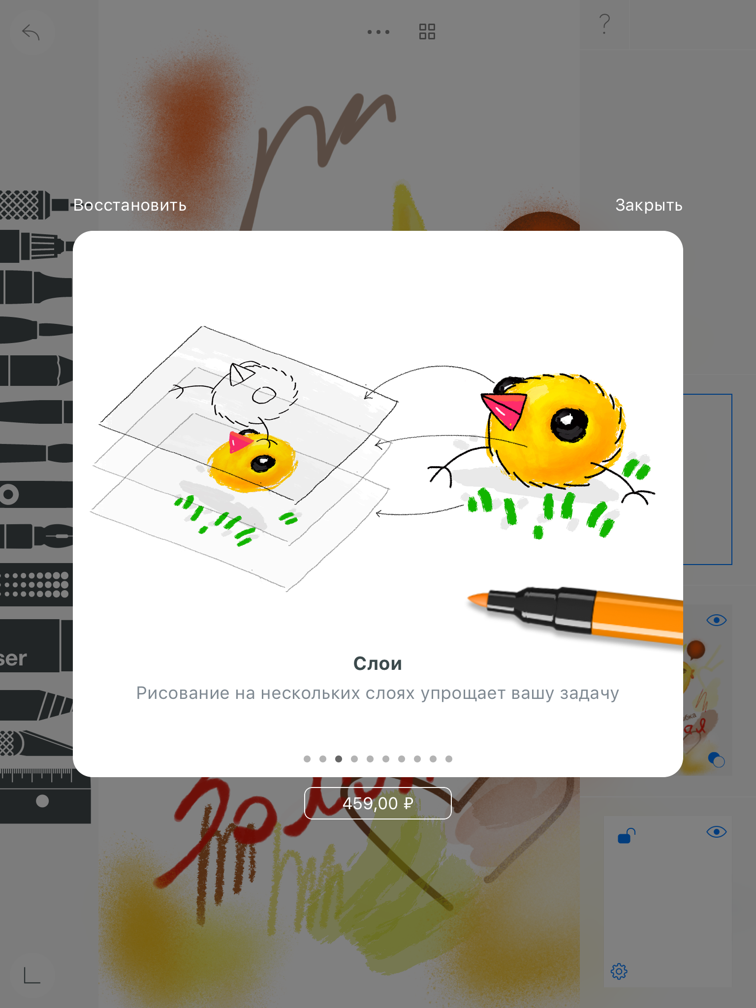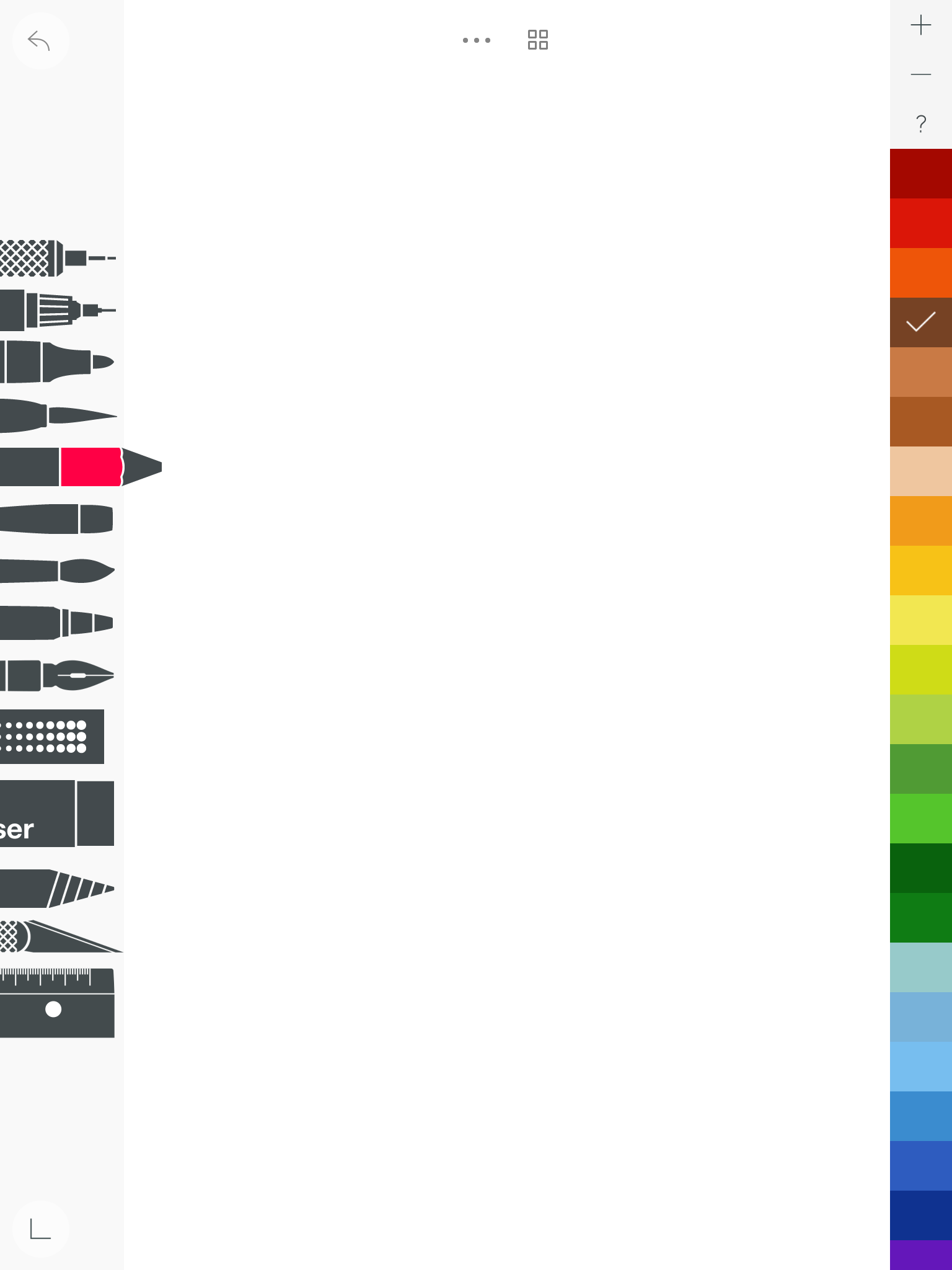 - куча инструментов слева, много цветов справа (можно добавлять свои легко), посередине рабочее поле, где и рисуем. Приближать/отдалять рисунок - пальцами по экрану.