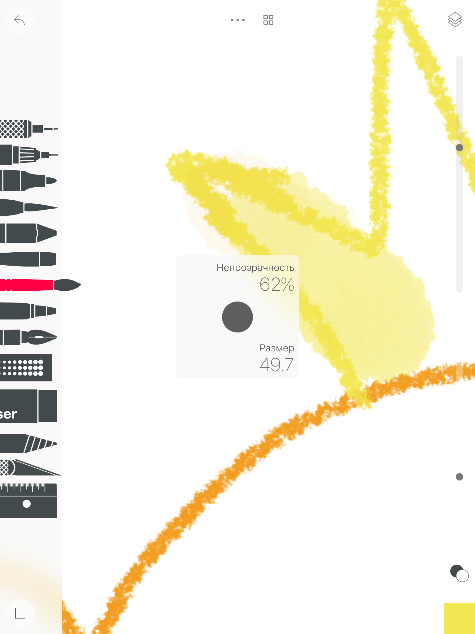 справа еще два бегунка - степень прозрачности и размер инструмента. Есть еще какие-то настройки, с которыми мне предстоит разобраться
