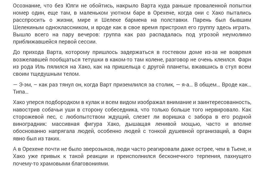 Перессказ вместо показа сценкой, развешивание ярлыков по факту события (написано, что всем своим видом что-то там выражал, то есть, придумай сам КАК ОН выглядел, вместо того, чтобы описать этот вид картинкой), плюс ещё до кучи пасхалки и прочие вроде бы негодяйства, которые только может придумать писатель, чтобы облегчить себе изложение и вытолкать меня из текста.
