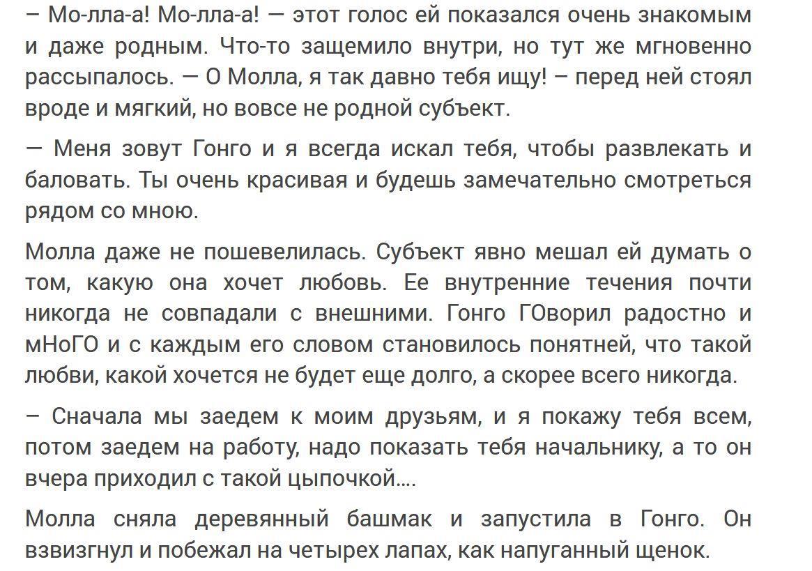 Моллу тоже "...когда-то давно окружали люди, общение с которыми превращалось в фейерверк остроумия и мудрости, иногда в своих речах им удавалось подняться на небывалую высоту, от таких попаданий мурашки шли по телу от удовольствия". Поэтому она и бросала башмаки в разных «Гонго, которые ГОворят мНоГО и бестолково». Поэтому она не понимала, как может «мистер Кумятра шутить над тем, что она не может достать мятры маленьким Моллам, но все же улыбалась, привыкнув общаться с каждым на его языке».