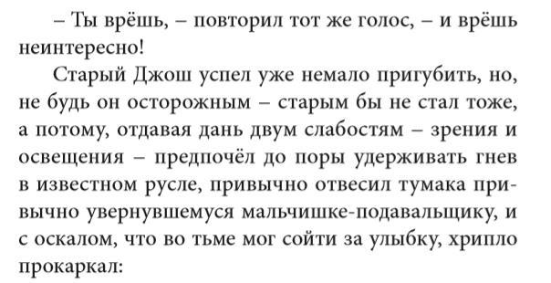 Но второй абзац закружит невнимательного читателя в водовороте длинного сложносочиненного предложения, заодно обрушив на него описания героя и места действия, лаконичные, но ёмкие – а также продемонстрировав умение автора пользоваться ритмом, рефреном и задав ироничную интонацию, которая будет теперь звучать на протяжении половины книги (отчего только половины – скоро станет понятно):