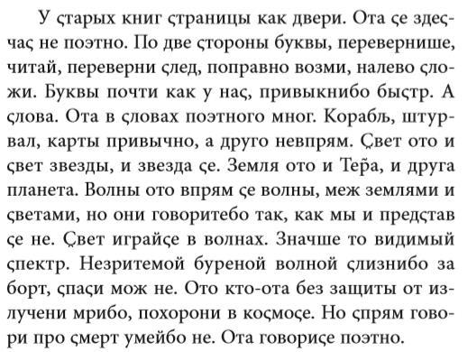 Если же читателя, упорствующего в своём намерении прочесть эту книгу, не отпугнёт первая глава, старомодно-роскошная и загадочная, то его ждёт новое испытание. Из испанского XVI века повествование хищным тигриным прыжком переметнётся в будущее, на другую планету – и безо всякого предупреждения сменит язык. В будущем, да ещё и на другой планете, и должны говорить иначе, верно ведь?