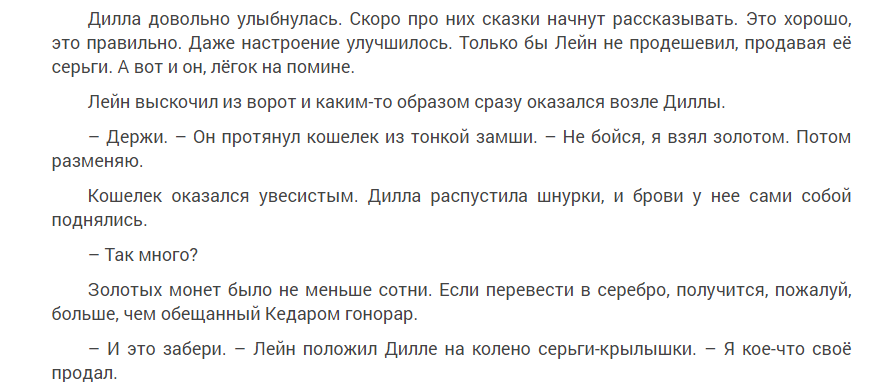 Вообще, что мне очень и очень понравилось - здесь нет ничего лишнего, все на своем месте. Даже недосказанности (чье сердце у Диви), - работают в том числе и на характеристику персонажей, а не повисли пустой интригой. Можно додумать, можно попытаться вывести из текста, можно оставить тайной. Хорошо.