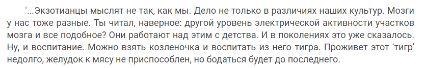 Вообще, непохожесть имперцев и экзотианцев, равно как и их похожесть, делает местный мир ярче, насыщеннее, интереснее. Здесь вам и сложные расчеты космических перелетов и прочее сопутствующее, и в тоже время вера в Темную Мать, которая себя довольно активно проявляет по отношению к своим детям. Здесь технологии по омолаживанию организма вполне сочетаются с умением эйнитов лечить "руками" или "силой мысли". (что-то около того)
