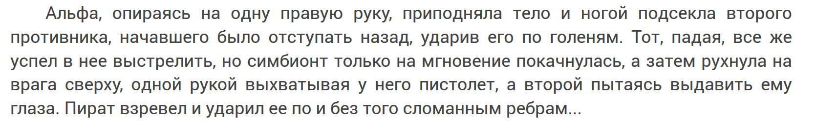 Не верю, сцена не складывается. Написать можно все - бумага стерпит, а вот в реале это проделать... Имея в руке Глок с 17-ю зарядами и противника на расстоянии вытянутой руки, можно стрелять в голову не целясь... Никакой симбионт не спасет. Да и выдавливать одной рукой глаза в такой ситуации проблематично, совмещая с борьбой за пистолет.