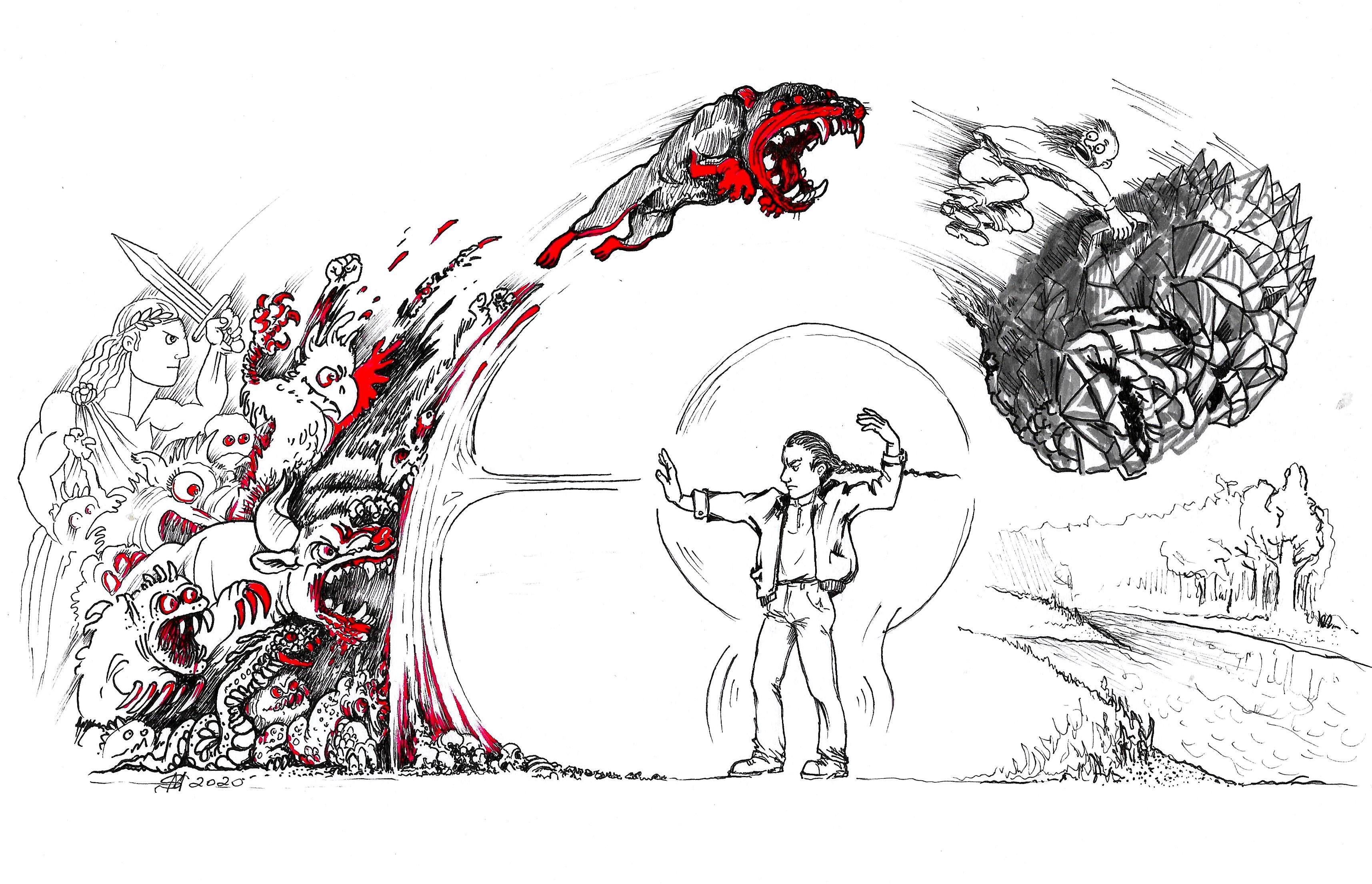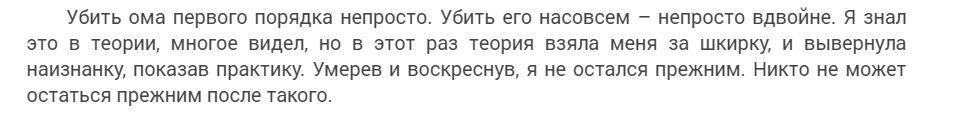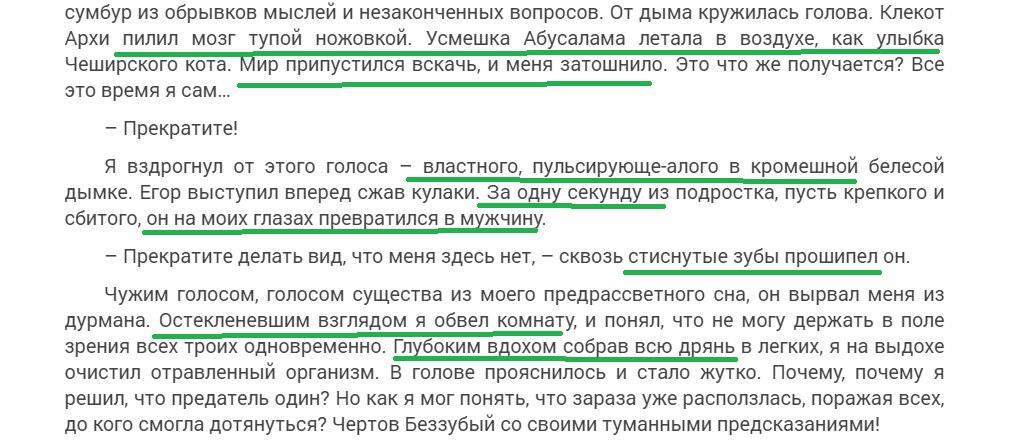 Но что хорошо, что постоянная экзальтированная экпрессия в подборке эпитетов и рубленная внезапность в перепрыжке мыслей изложения маскируют легкую стилистическую невычитанность и всё-таки держат внимание читателя в тонусе, не давая скатиться в так сказать равномерный трэшак раздуваемых ветром младенческих трупов и кровавых зрачков, стекаюших по измождённым скулам упырей. (Написанное курсивом взято из иного произведения для гиперболизации)