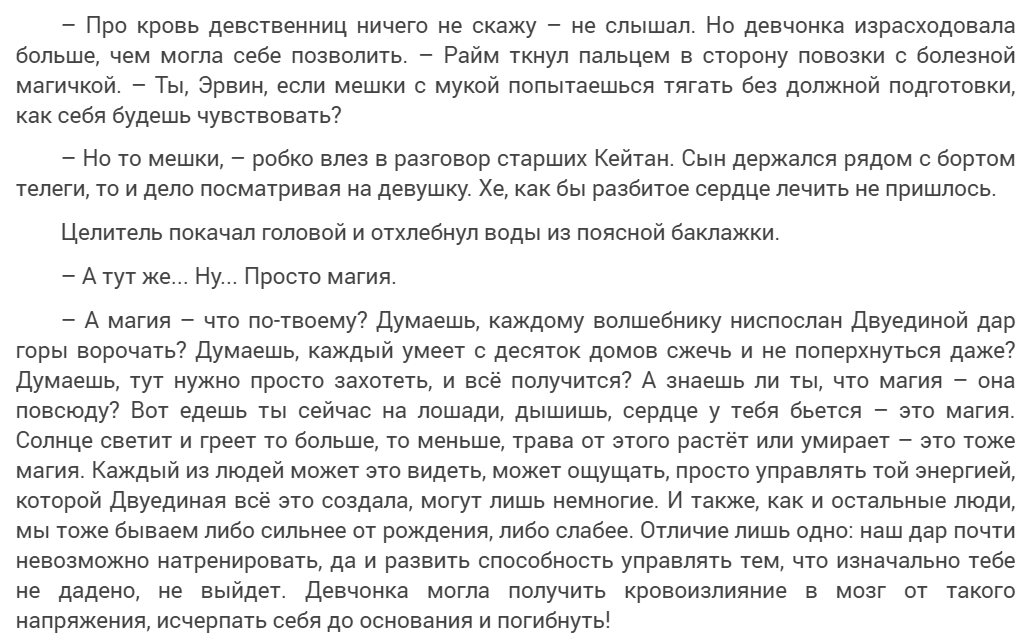 В общем, столько разных точек зрения распахнули мир нараспашку. За какие-то неполных пятнадцать авторских листов я увидела столько людей, столько мест, столько совершенно различных по масштабу ситуаций, что остается только восхищаться. Я даже (вроде) разобралась со всеми интригами, где хватало вводных данных — как самый яркий пример можно взять смысл названия, проследить все аккуратные подводки насчет некромантов и посмотреть в какой сюжетной линии это все сойдется, на каком человеке, было нетрудно. Поначалу явственно ощущался недостаток знаний о магии, но автор настолько изящное определение сложила в уста одного из персонажей, что я была очарована: