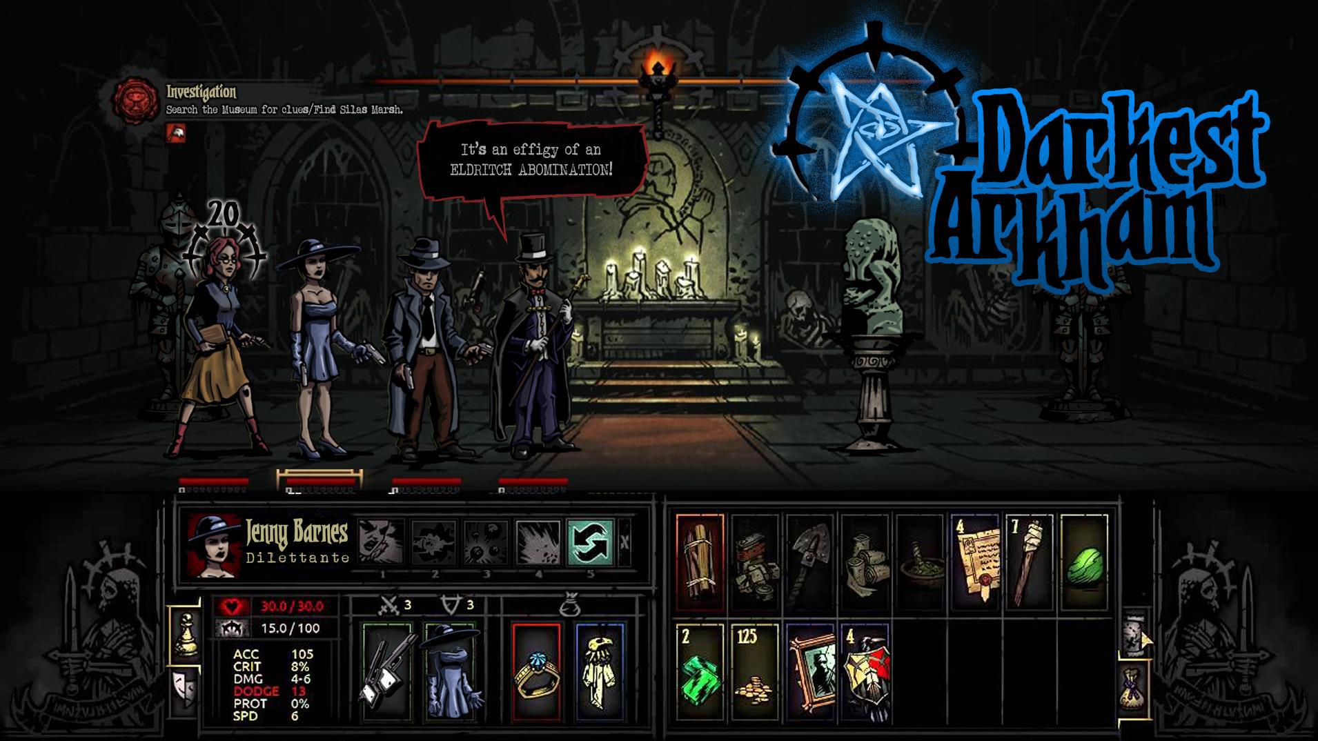 Это микс Arkham и рпг-рогалика Darkest Dungeon. Этакий Darkest Arkham, если хотите. Для тех, кто не в курсе, «Ужасы Аркхема» – это настолка, основанная на творчестве Г. Ф. Лавкрафта, где игроки исследуют вымышленный город, на улицах которого открываются порталы в иные миры и появляются злобные твари. Darkest Dungeon – это достаточно известная, атмосферная и хардкорная РПГ-шка, где вы управляете партией приключенцев, исследующих мрачные подземелья заброшенного викторианского поместья.