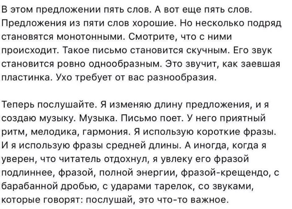 Текст состоит из коротких рубленых предложений, где места запятых зачем-то заменили точками. Этакая серая, монотонная машинопись. Да. Короткие предложения. Немного грубоватые. Зачем? Непонятно. Очень хочется привести пример из известного мема: