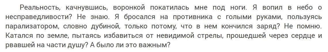 Итог. Когда у героя дело доходит до дела — исчезает самое главное: конкретика окружающего мира и взаимодействие героя с миром. Мира нет. Есть потоки сознания сомнений и переживаний по поводам, далеко не всегда связанным с миром.
