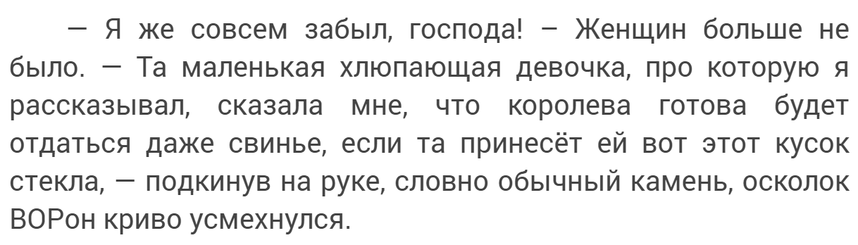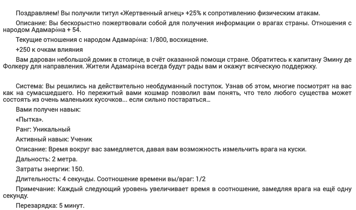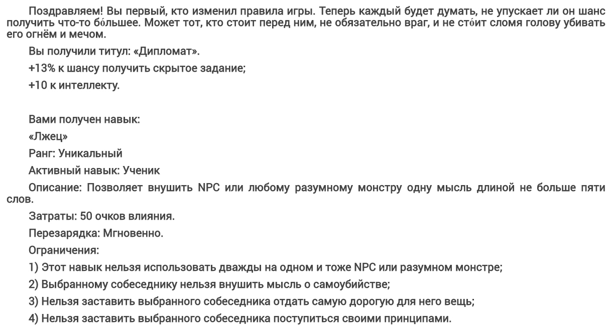 С какой небрежностью прописываются диалоги, и равно диаметрально — описания вещей и получаемых титулов. Просто рай для фетишиста, у которого история маскируется под предмет.