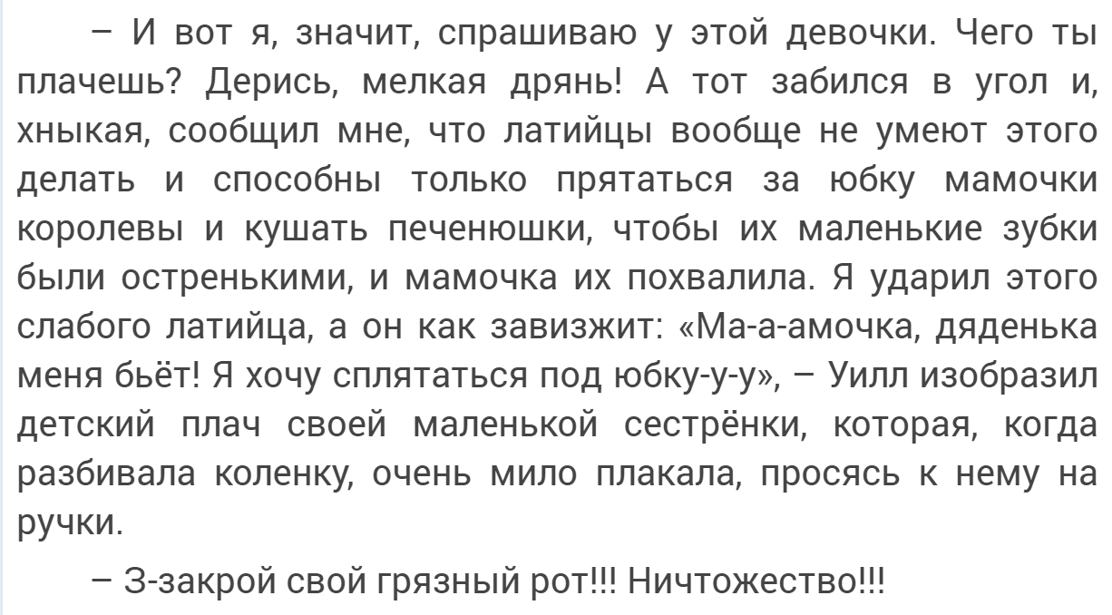 Вообще диалоги в произведении традиционно унылы, но это, как оказалось, только плюс, ибо даже мне не удалось предвидеть тот адЪ, что начнётся дальше. Всё было более-менее нормально, — повествование движется, тупые диалоги тупо диаложатся, я зеваю — но идиллия продолжалась ровно до того момента, пока ближе к концу книги у протагониста не начался спонтанный no way out диалоговый понос из-за появления NPC-компаньонов (очень удобный ход — можно обойтись без участия людей там, где они всё же нужны) и других игроков. И это полный кошмар, это хуже даже, чем у Лавкрафта — а чтобы писать диалоги хуже Лавкрафта, надо реально постараться. Последние главы было физически больно читать из-за пустоты и тупости этих лишённых логической глубины словесных конструкций. Короче, просто цените то время, когда Уилл молчит, а не порет какую-то чушь, по-тупому тролля NPC и игроков, кайфуя попутно от собственной упоротости.