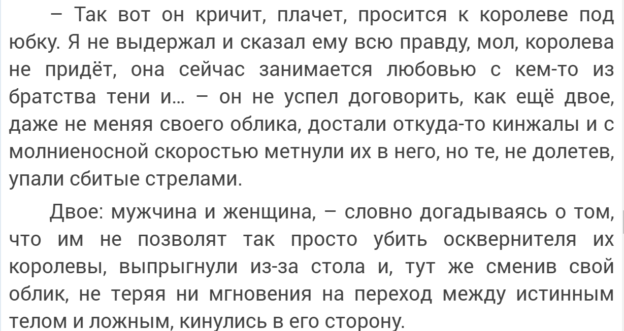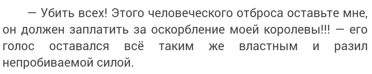 Вот и подошли мы к моему любимому моменту — квест на выявление жуков-шпионов. Как наш герой, бывший переговорщик антитеррористического подразделения, будет выявлять шпионов? Может он, как Анасуримбор Келлхус, воспользуется знанием анатомии и обнаружит, что под кожей двигаются не те мышцы? Попросит сказать «шибболет»? Нет, наш герой не таков. Он пойдёт другим путём, а именно — применит к замаскированным шпионам пранк в духе «я тваю мамку ибал, лохЪ». И я не шучу. Просто проникнитесь этим монологом, который растащен аж на две главы.