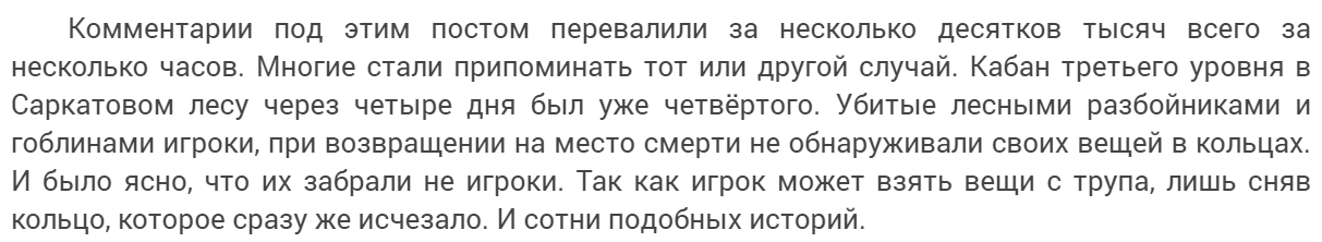 Точно также и здесь любовно описываются предметы, добытые Уиллом во время игры; описываются так, как будто относятся к сфере реального мира, а не к миру нулей и единиц. Мнимые достижения преподносятся как реальные — из-за «уникальной» возможности конвертации игровой валюты в реальную — видимо, по аналогии с PLEX (Pilot’s License Extension, «разрешение на продление удостоверения пилота» — донатная валюта из «EVE Online»).