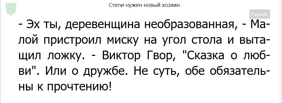 Катастрофа, ужас, на меня пожаловались соседи, мол, из моей квартиры по ночам издаются странные звуки. Ну как им бледнолицым объяснить, что я не виновата. Во всём виноват автор книги "Степи нужен новый хозяин". Мой бедный животик, чуть не лопнул от смеха, я не могла остановиться, и к моему сожалению, забыла на время посмотреть. Короче: "Если херово, читайте Гвора".