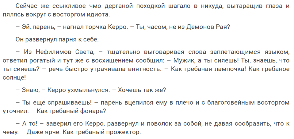 Весьма интересные рыла вроде местных Ушлых и прочих «паханов на районе». В том плане, что вторичные, третичные и прочие персонажи прописаны достаточно, чтобы не выглядеть просто статистами. Даже те дебики, которые отлетают буквально тут же, только появившись на сцене, они хоть и до жопы стереотипные (настолько, что вызывают вопросы «вы как до своего возраста вообще дожили в таких условиях и с таким поведением?»), но хоть как-то обрисованы, что не может не радовать глаз, а в моём случае уши (ведь три главы я всё-таки слушал, а не читал). Потом, впрочем, я прослушанные главы ещё немного полистал, пока готовил рецензию, так что глаз тоже порадовало.