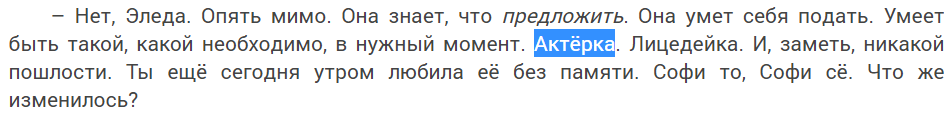 …от которой у меня полыхнуло даже несмотря на то, что это фраза конкретно взятого персонажа, манера речи у неё такая. С одной стороны, я уже читал текст, напичканный феминитивами по самое не хочу, но там это было уместно. Здесь же я до сих пор не увидел уместности «актёрки» в значении актрисы.