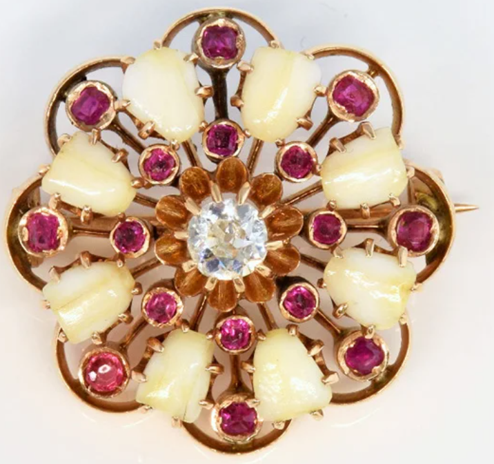 Детей потом все возвращают к жизни - случившееся нельзя посчитать полноценным воскрешением, но наши герои - брат и сестра, Вайолет и Калеб - не станут маленькими зомби. И тут начинается новый виток раскрытия отношения к смерти. У детей. Только что потерявших родителей. Автора нельзя упрекнуть в недостатке рефлекси (хотя она здесь обозначается довольно условно), но дети демонстрируют поразительную мудрость в вопросе умирания. Отчасти это объясняется тем, что их мать была медиумом, отчасти - самой эпохой и местом действия. Нужно отметить, что викторианская Англия была в очень близких отношениях с загробным миром. Думаю, все слышали про фотографии с умершими членами семьи. А еще там было принято разбирать трупы на артефакты (и речь не только о том, чтобы растащить на талисманы казненного преступника). И носить с собой, а как же. Тут, правда, зубы не с трупа, но вполне себе человеческие. Детские. А еще там глазик есть. Красота же!В общем, сложные отношения со смертью в викторианской Англии. И то, как дети реагируют на смерть родителей, кажется удивительно органичным - да, они тоскуют. А мальчик чувствует себя оскорбленным, у него совершенно не холодный английский характер, который обещает нам в будущем очень обаятельного и темпераментного мужчину. Но это не мешает Вайолет и Калебу жить новой жизнью. Находить новые привязанности, получать удовольствие от еды, тянуться к новому. Вайолет - трогательная девочка-фиалка, очень милая, но скорее оттеняющая другого персонажа.