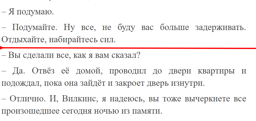 «До» разговор происходит между Смитом и Авы, когда повествование шло от лица Авы. «После» разговор уже между Смитом и охранником, который отвез Аву домой и вернулся к начальнику. И да, я не говорю уже о том, что теперь уже повествование ведется от автора о мистере Смите. В других моментах отсутствие разделения особенно не смущает, но здесь разрыв проходит среди диалоговых реплик, а потому перечитываешь этот момент и думаешь «Что это?».