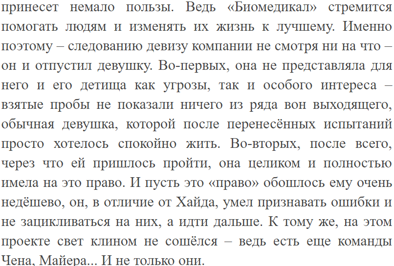 Вроде бы одно и тоже, только мол сказанное другими словами. Но вот меня очень сильно смущает это, что на проекте Хайда свет клином не сошелся. Да. И мистер Смит, уже давно это для себя решил. Потому он и отпускает девушку - ведь проект уже закрыли. А пересеклись они с ней только из-за выходки самого Хайда. Может быть это попытка покрасить нейтрального персонажа в белый цвет, однако, зачем? Пусть бы он и оставался для читателя таким, как остался для Авы - таинственным, немного пугающим. Главная героиня всех этих тонкостей не узнает. Это видно лишь читателю. И опять вопрос, зачем мне узнавать еще раз, тоже самое. Ведь Смита не интересовала Ава уже в тот момент, когда он обсуждает закрытие проекта. Зачем еще раз подробно расписывать, почему он ее отпускает? Мол вот, девушка столько всего пережила, бедняжка, пусть идет себе с миром. А её планировалось удерживать? Нет...