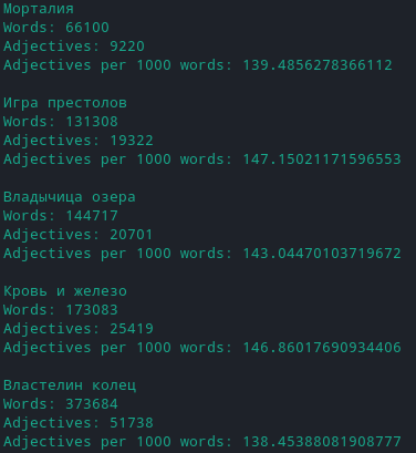 Первое, что бросилось в глаза - количество прилагательных. Дабы не быть голословным, я посчитал количество прилагательных в книге. Я был удивлён, но показатель является средним по палате.