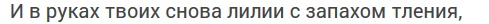 Если любишь, то в лилиях подмечаешь их красоту, а не запах. В серенаде под окном подмечаешь красивые слова песни, а не фальшивые ноты. Т. е. фальшь-то ты слышишь, но не она важна. А тут в руках не прекрасные лилии, а лилии с запахом тления. Я понимаю, рифма и все такое, но... не приемлю любви с таким запахом.