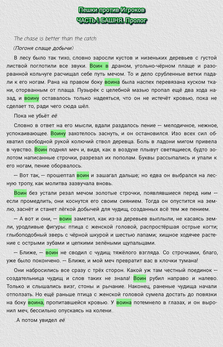 Самая слабая сторона «восстания» – текст. Много повторов уже с первых страниц. Мои любимые «были», «меня», «я» разбросаны по доске через каждую клетку. Словарный запас оставляет желать лучшего. Заметно применение разных приёмов, но все они сходят на нет из-за слов «пешка-пешка-пешка».