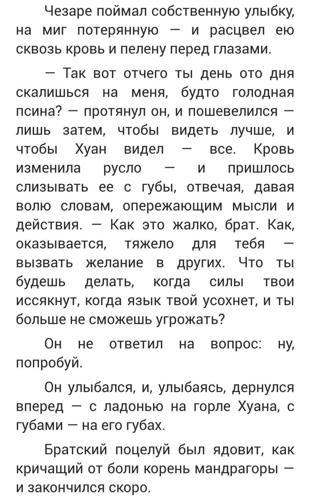 Провокация уже не присутствует фоново. Она становится во главу угла. Брат целует брата, и выглядит это, будучи описано тонко и красиво, едва не слэшной фантазией сентиментальной женской литературы (не фикбука все же в силу стиля).