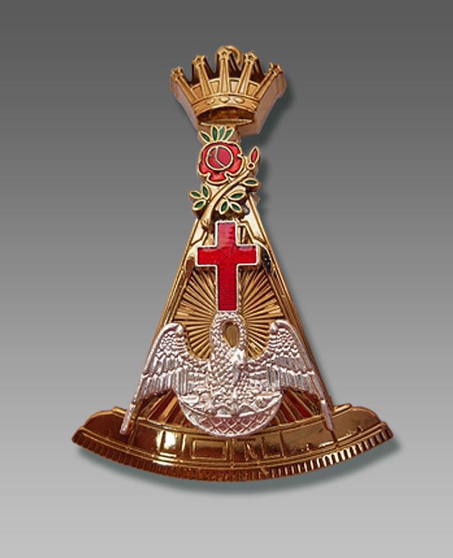 Подвеска треугольного типа, с вытянутым верхним углом, и представляла собой подвеску из золота, на которой, в центральной её части с выгравированным на ней солнечным свечением, были прикреплены выполненные из драгоценного камня красного цвета крест и раскрытый бутон розы. Под крестом на подвеске располагалось изображение какой-то птицы, типа орла, с двумя опущенными вниз крыльями, сидящей на чём-то, очень напоминающем гнездо. Верхний же угол этой подвески, над розой, венчала то ли корона, то ли возвышающаяся часть рыцарской башни.