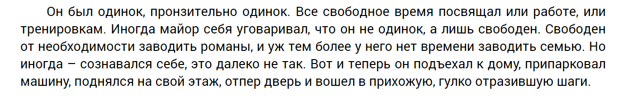Еще раз повторю, что произведение читается легко. Возможно из-за того, что все главы короткие и в них описываются самые главные моменты, происходящие в данное время. Также текст написан грамотно, хотя и встречались описки и ошибки типа -ться/-тся. Но хочется обратить внимание вот на этот абзац в главе 121: