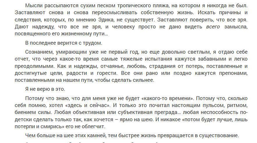 Кружевных феечек и фиалковых суперменов, читающих за ради слияния с положительным героем и его дрочильно-обогатительными приключениями, просьба не беспокоиться. Герой тут не для компенсации вашей жизненной никчёмности, а для включения мозгов у тех, у кого они еще есть.